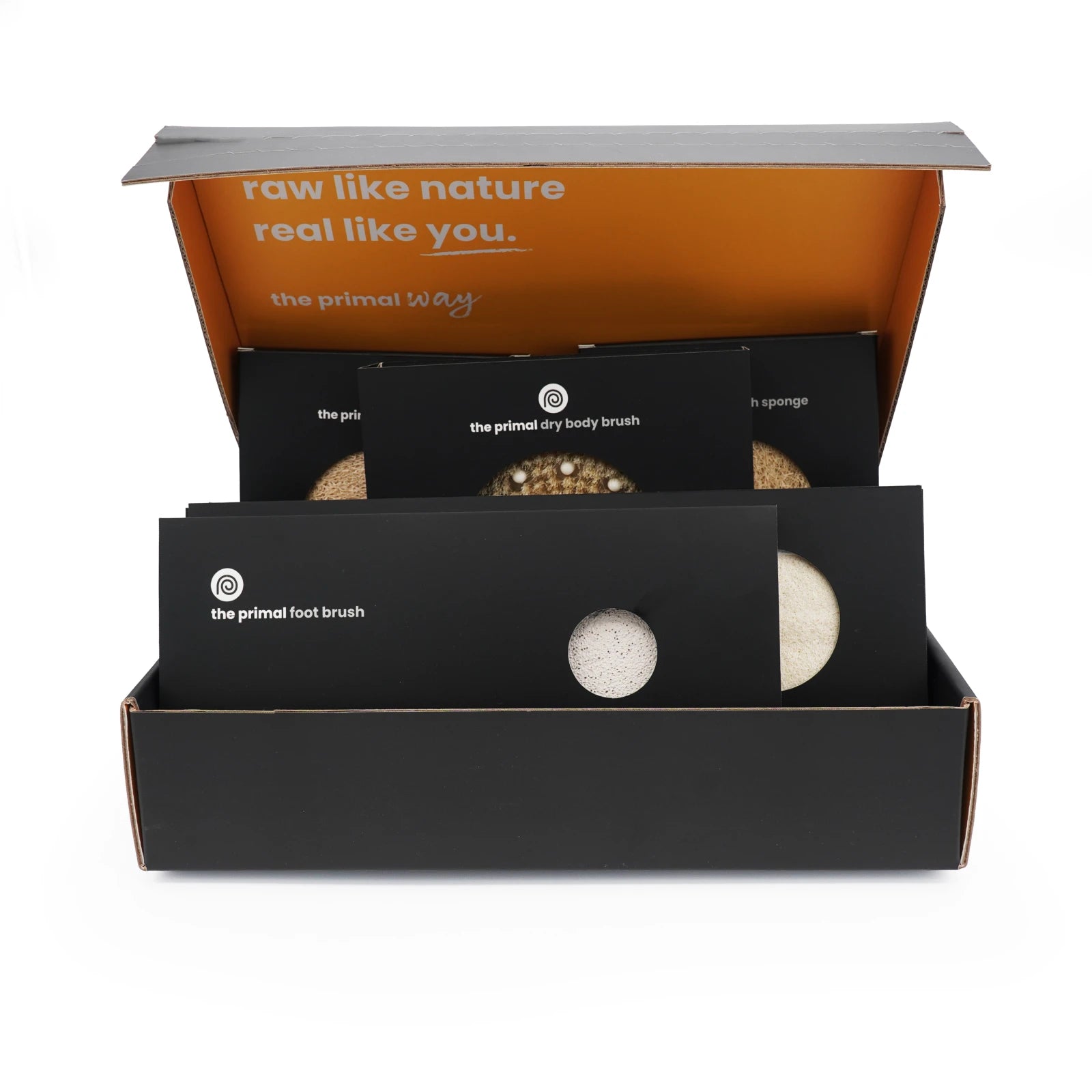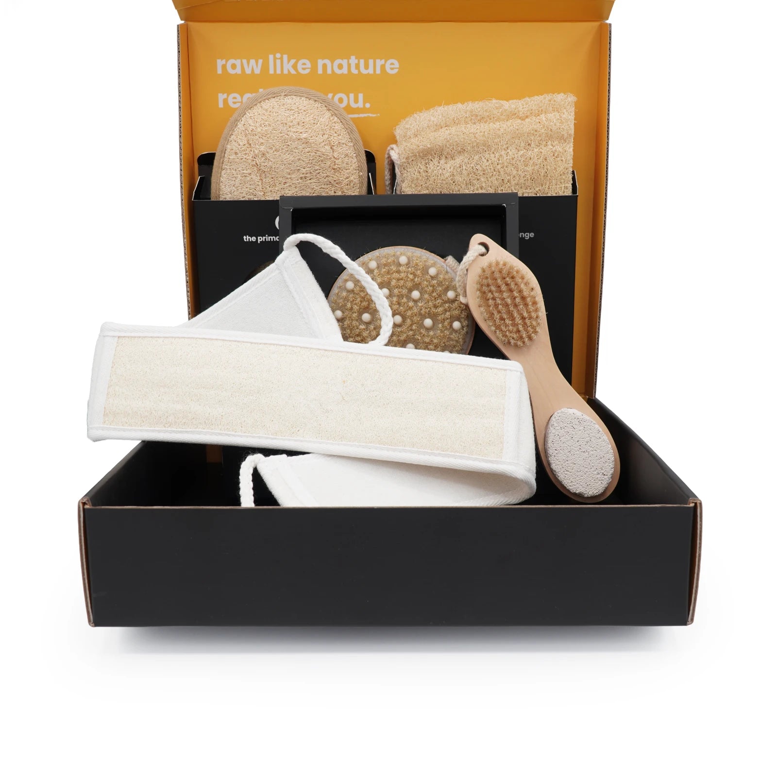 The Primal Exfoliation Set includes a dry body brush, loofah sponge, loofah pad, long scrubber, and foot brush—designed to gently remove dead skin, unclog pores, and boost circulation. From daily cleansing to deep exfoliation, each tool helps reveal softer, smoother, and healthier-looking skin.