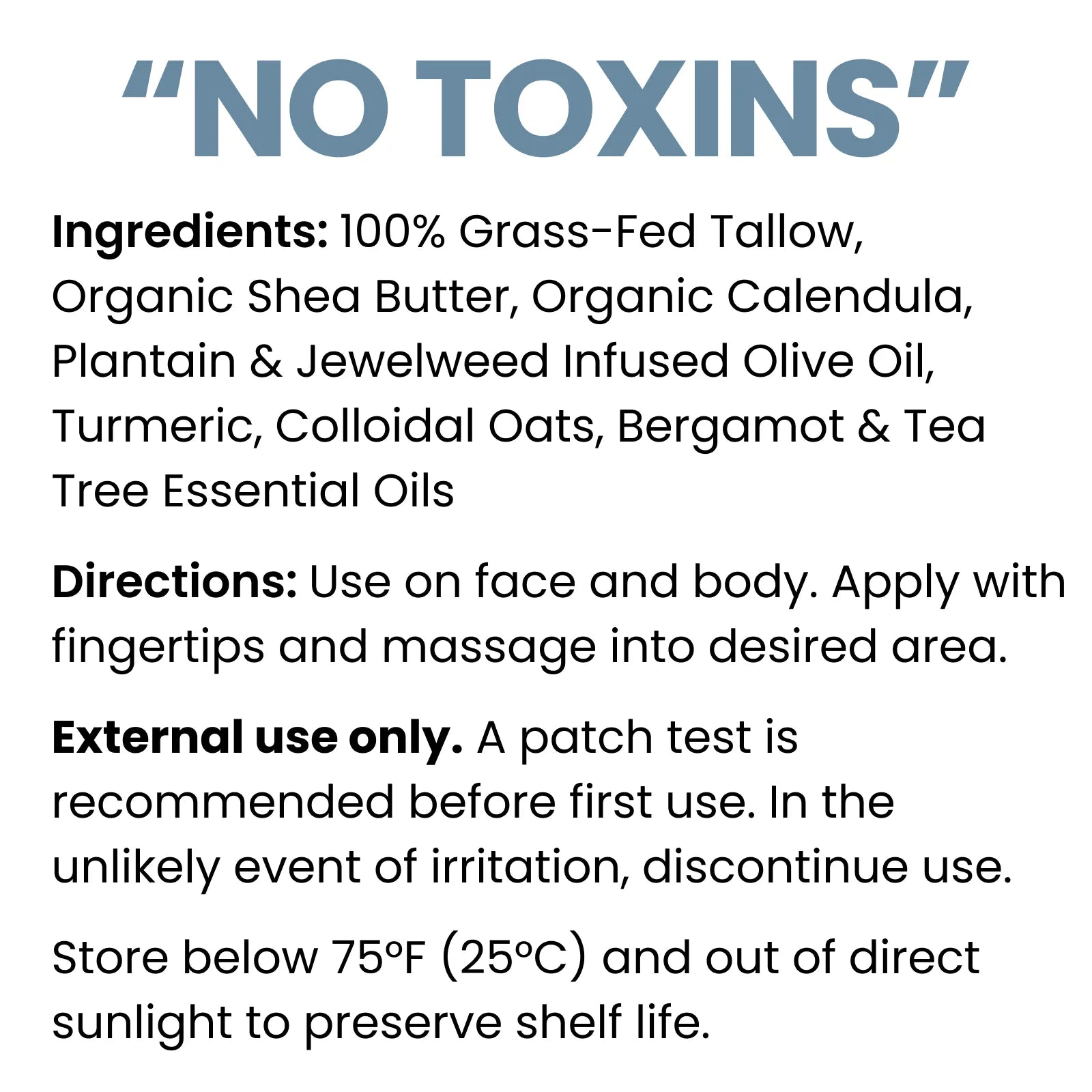 Nourish your skin with gentle, skin-loving ingredients. Made from 100% Grass-Fed Tallow, Organic Shea Butter, and Olive Oil infused with soothing herbs, this balm is free from harsh chemicals and artificial fragrances. It’s suitable for sensitive skin and ideal for dry, reactive, or problem-prone areas.
