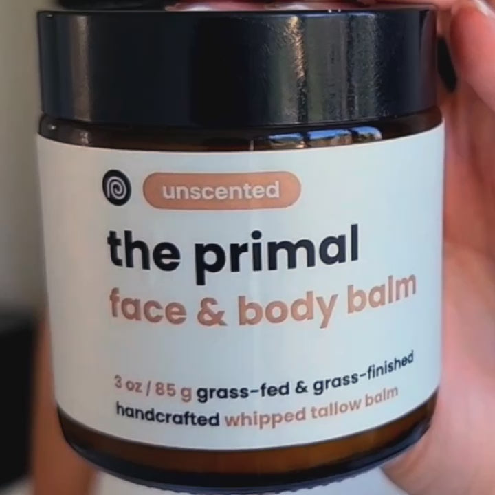 Simplify your skincare routine with one versatile product. The Primal unscented whipped tallow balm is perfect for your face, body, lips, hands, feet, and even tough dry patches. You no longer need multiple skincare products, as the Primal all-in-one balm has you covered!